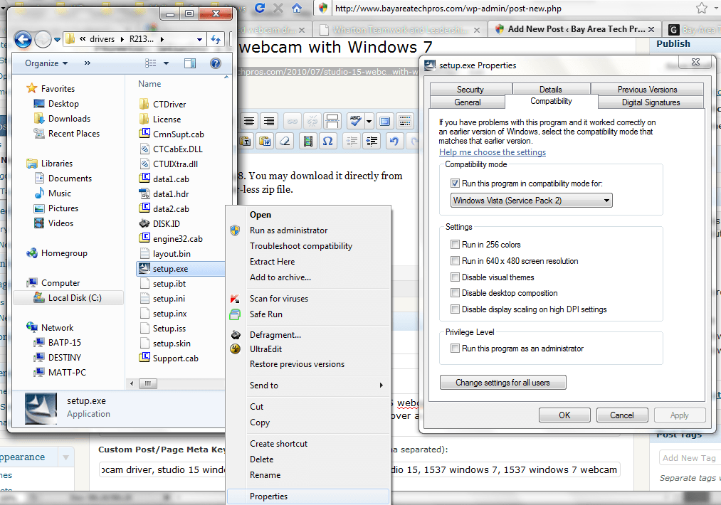 Step 4: Go to the driver directory, find setup.exe, rightclick on it and go to properties, find the Compatibility tab and select run in compatibility with Vista SP 2. Look at the picture if you get confused.