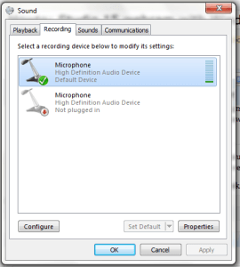 and when i go to control>sound>recording and tap on the mic(holes by webcam) no green bars appear